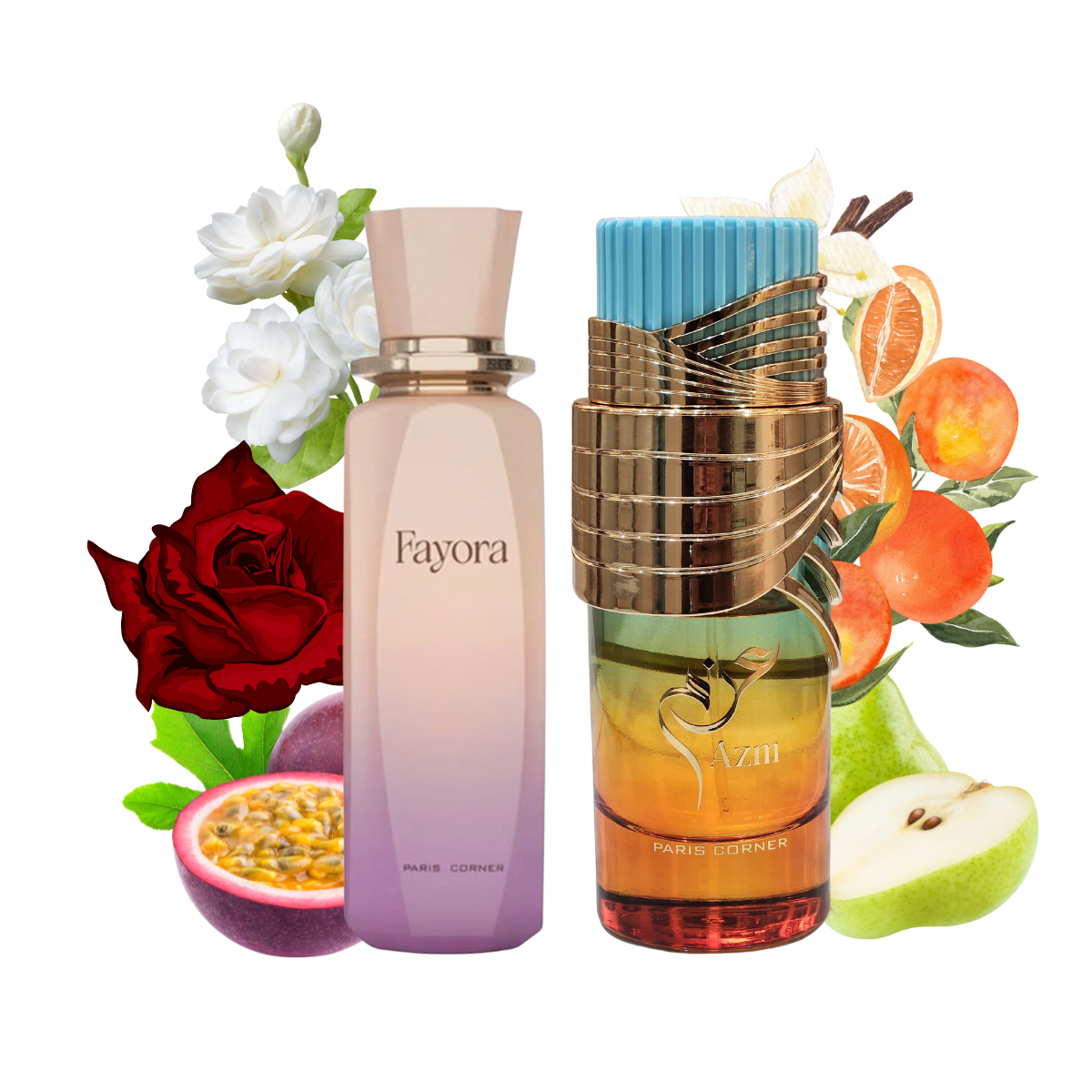 Together, Fayora and Azm bring you the best of both worlds — the romantic elegance of florals and the uplifting energy of summer fruits. A versatile duo that transitions effortlessly from day to night, from timeless femininity to sunlit sophistication.