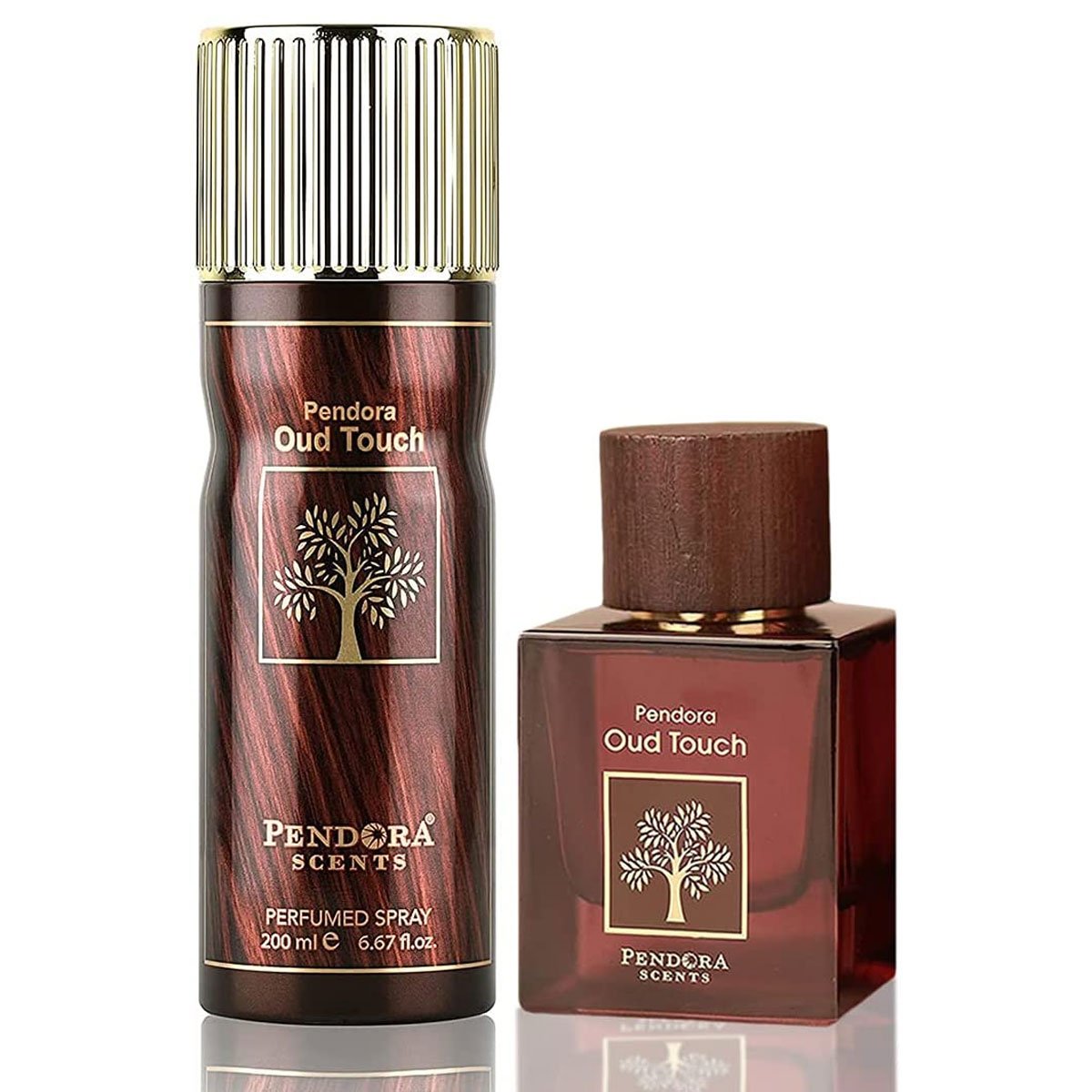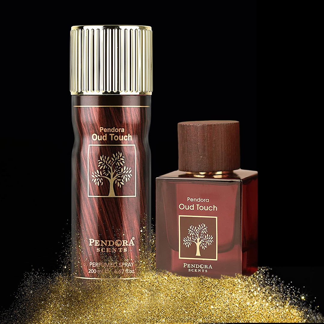 Oud Touch is a Woody Aromatic EDP and body spray fragrance for men. Oud Touch opens up with sweet fruits, and incense, spices, resin and rose when it's settled down, amber and musk at the dry down. The drydown is a more merciful musk and patchouli with trace impressions of the rose, oud, and incense. The “Oud Touch” Eau de parfum for Men is one-of-a-kind and excitingly sharp and ravishing fragrance. One of our finest EDPs specially designed set for a perfect gift to your beloved.